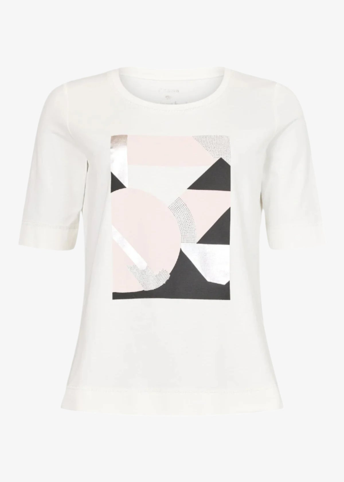 Elevate your everyday style with the I'Cona Scoop Neck Elbow Sleeve Tee, featuring a flattering scoop neck and a bold semi-circle graphic print. Perfect for casual chic looks.