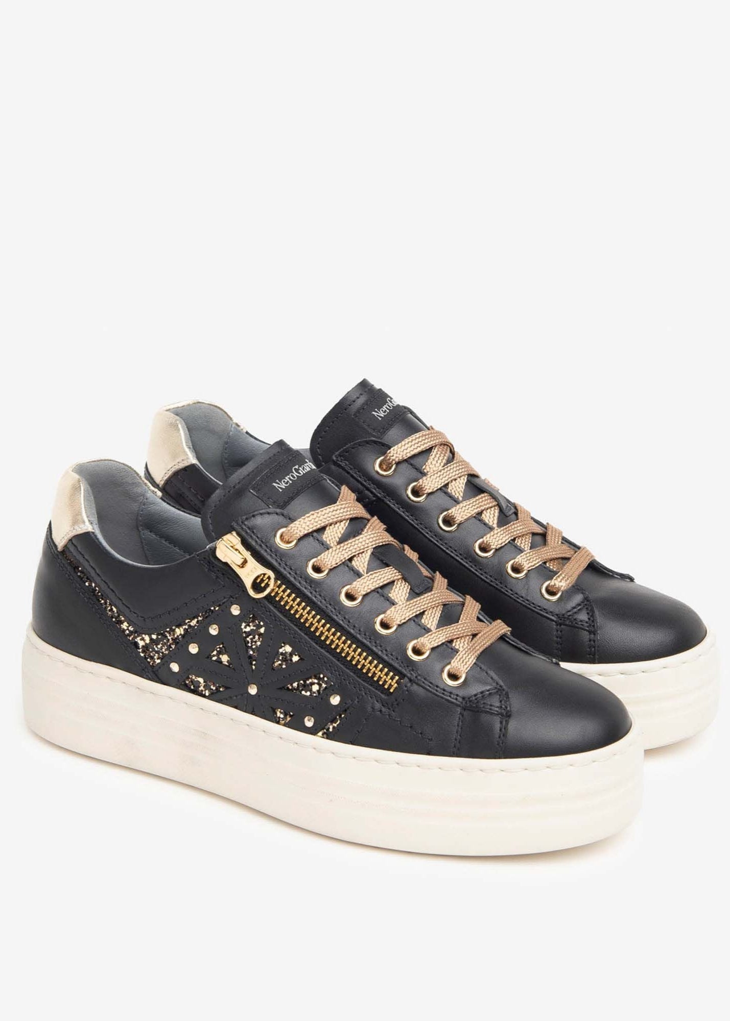 Nero Giardini Lace Up Leather Embossed Runner in Black