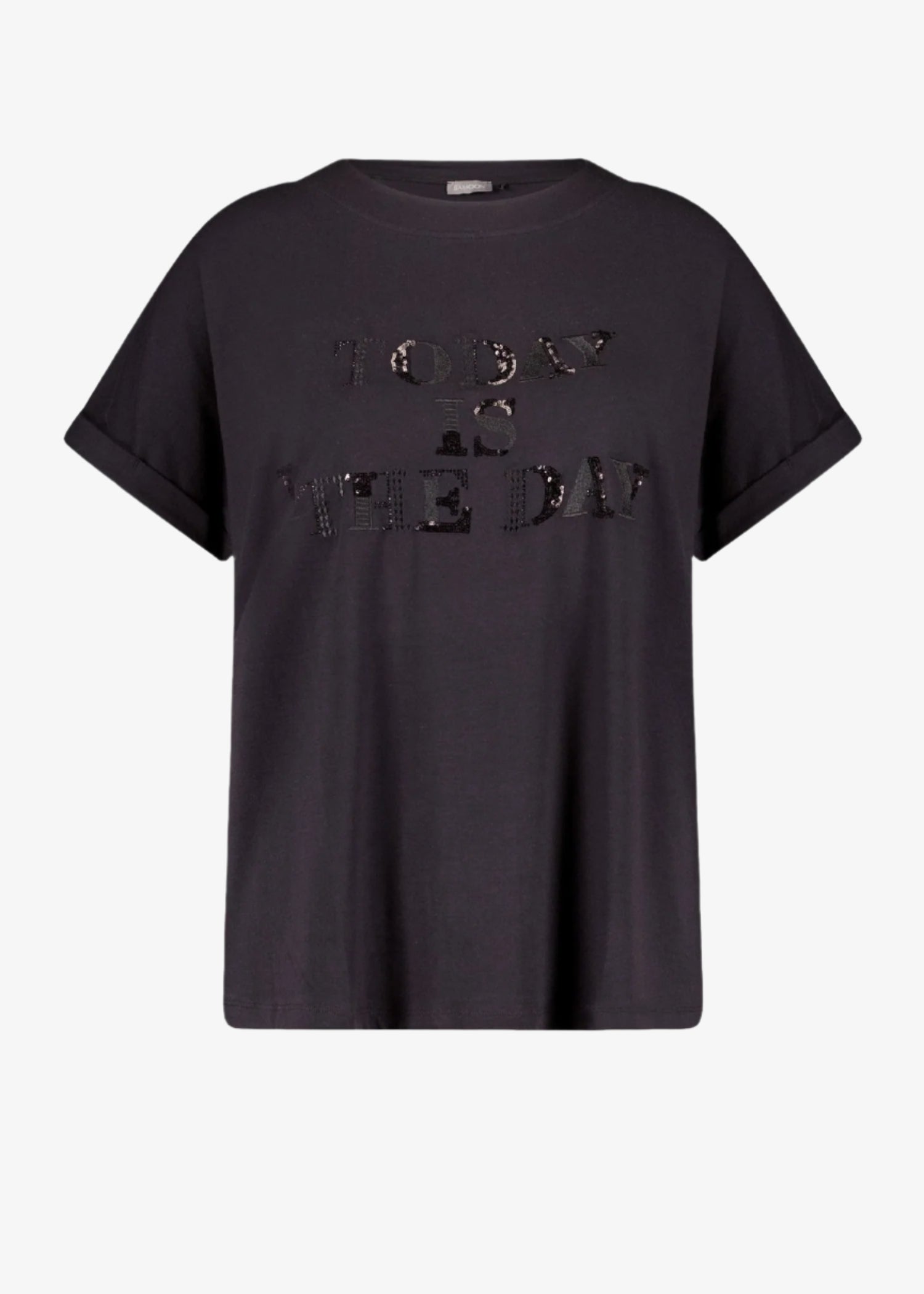 Elevate your everyday style with the Samoon beaded ‘Today is the Day’ T-shirt. Crafted from a soft modal-cotton blend stretch jersey, this black cuffed short sleeve tee features a chic beaded slogan, offering comfort and confidence in every wear.