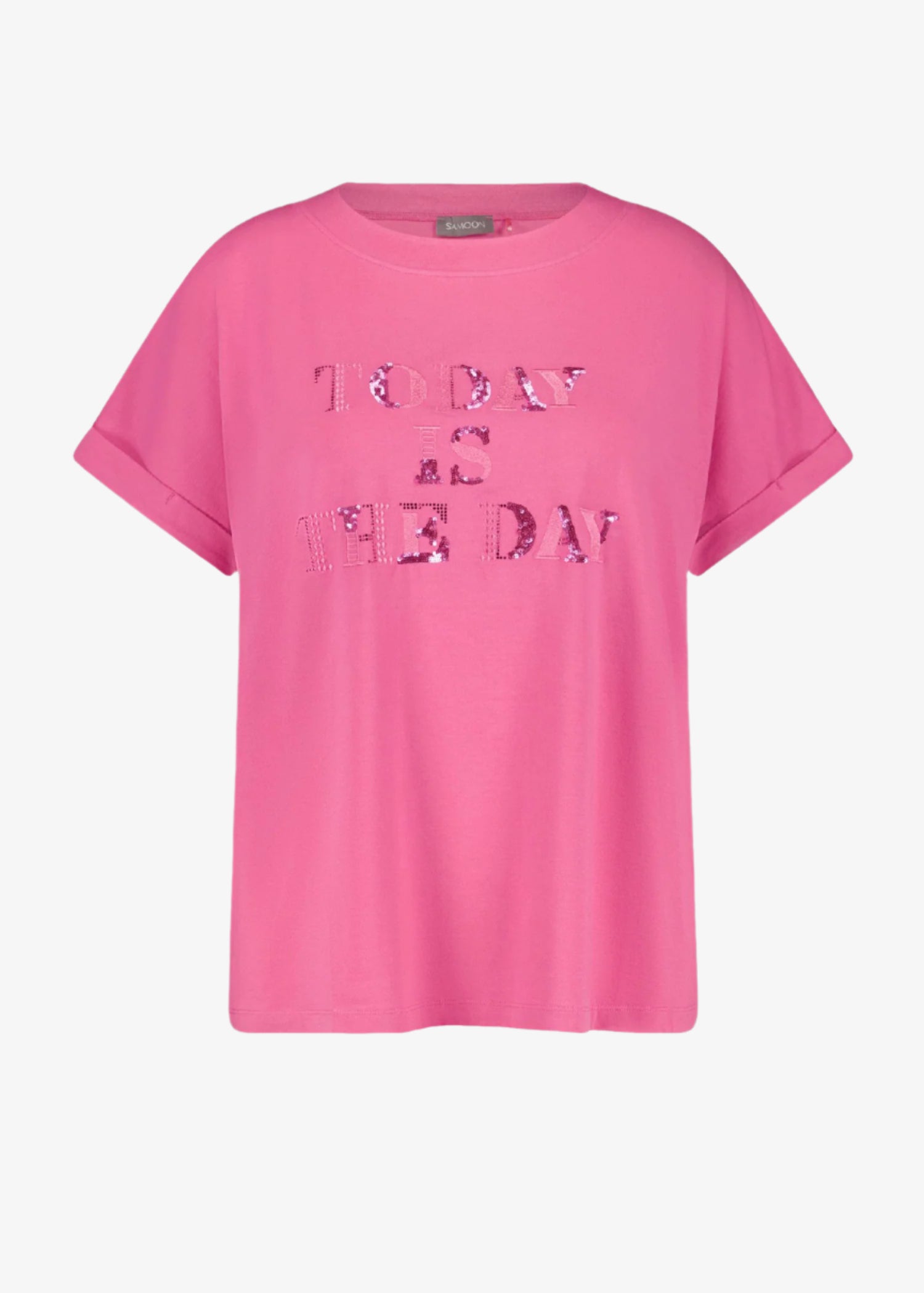 Elevate your everyday style with the Samoon beaded ‘Today is the Day’ T-shirt. Crafted from a soft modal-cotton blend stretch jersey, this black cuffed short sleeve tee features a chic beaded slogan, offering comfort and confidence in every wear.