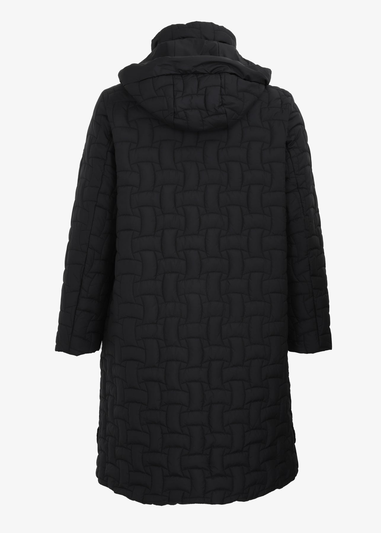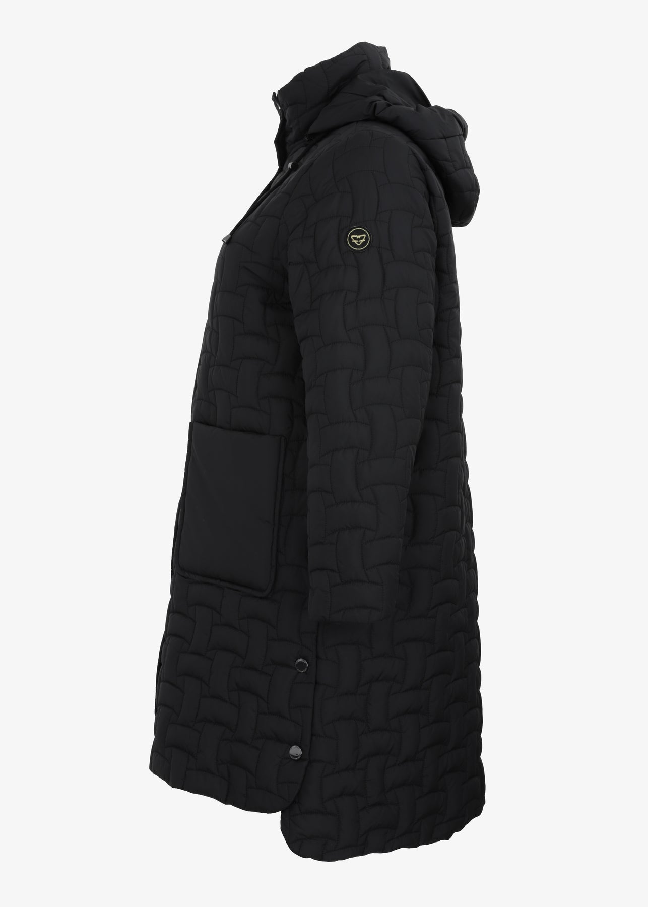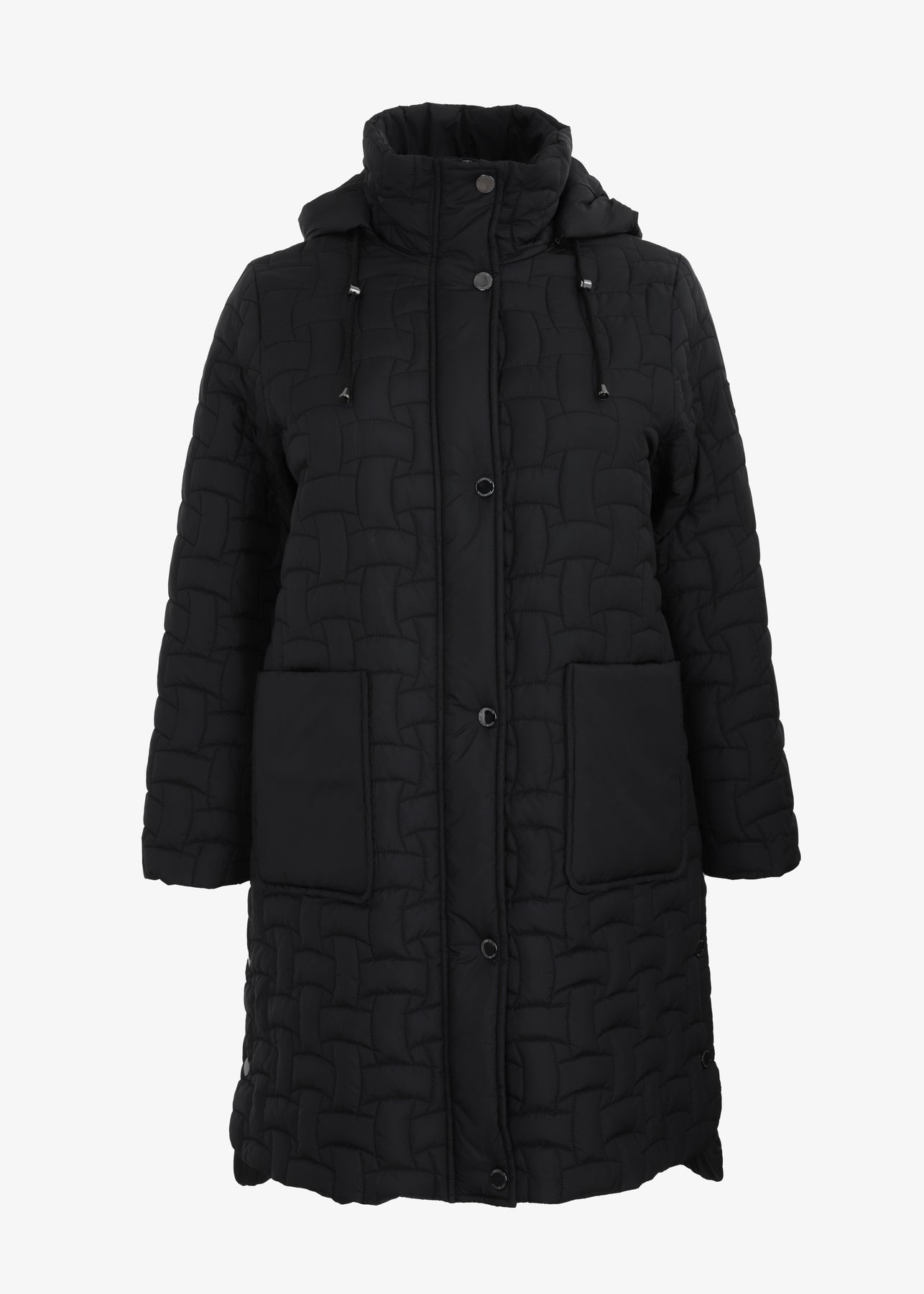 The Frandsen Long Basket Weave Quilted Coat features side slit snap closures and a detachable hood, offering adaptable styling options.