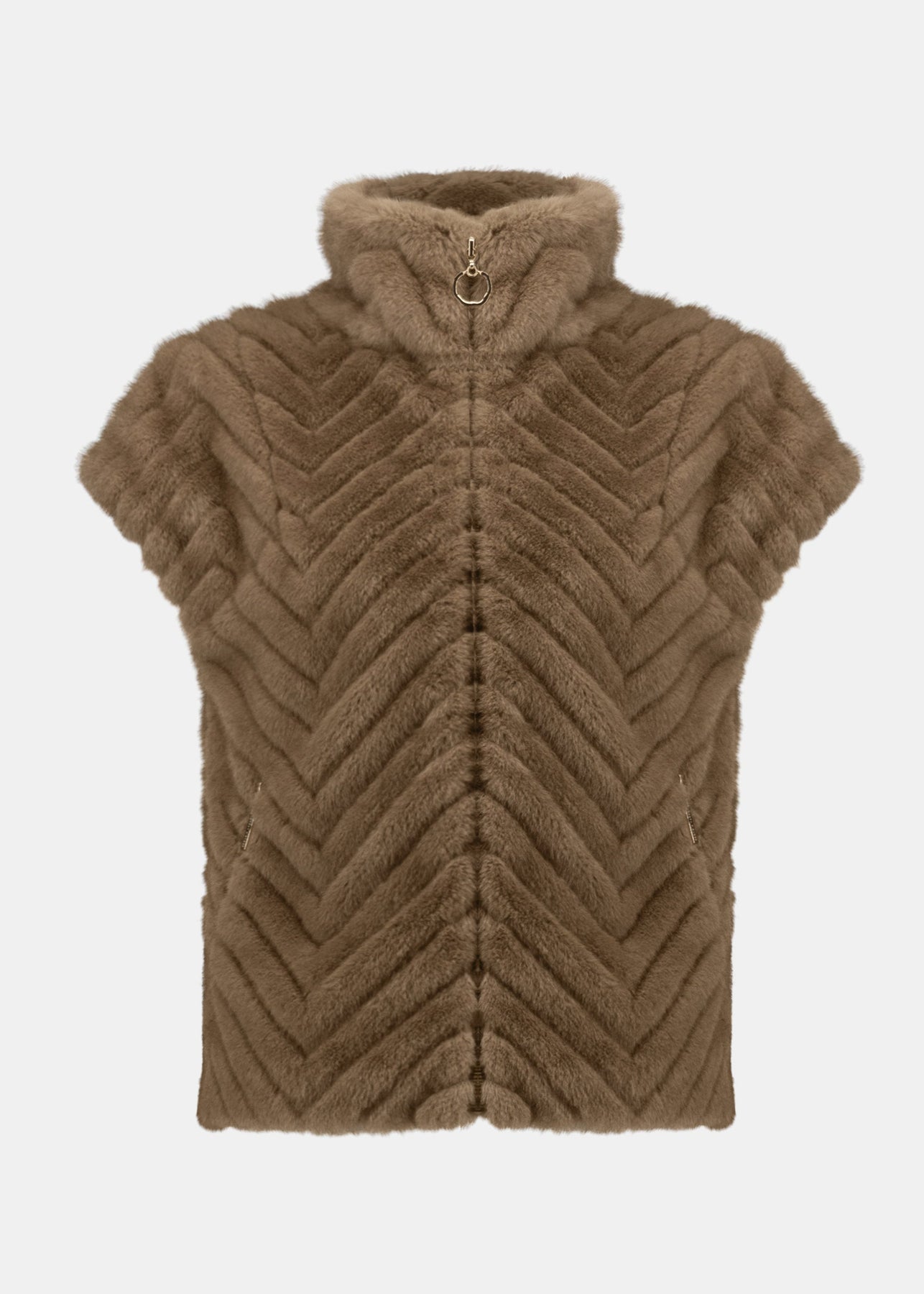 front view of plus size Joseph Ribkoff Chevron Faux Fur Mock Neck Zip Front Vest in Mink