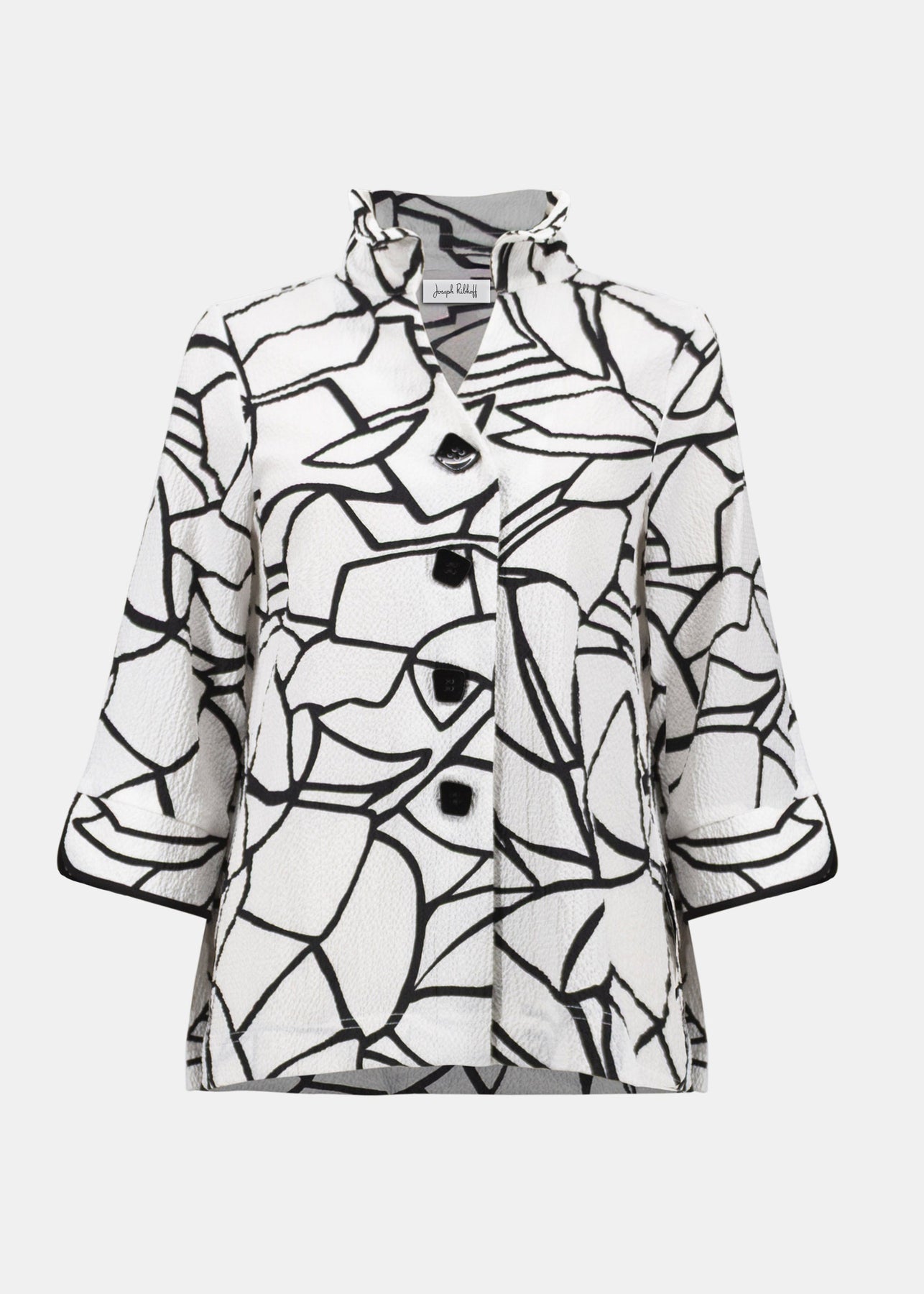 Softly structured with artistic flair, this Joseph Ribkoff abstract printed seersucker jacket features a shirred wired collar, contrast button front closure, and three-quarter cuffed sleeves. Side slits give the trapeze silhouette relaxed movement.