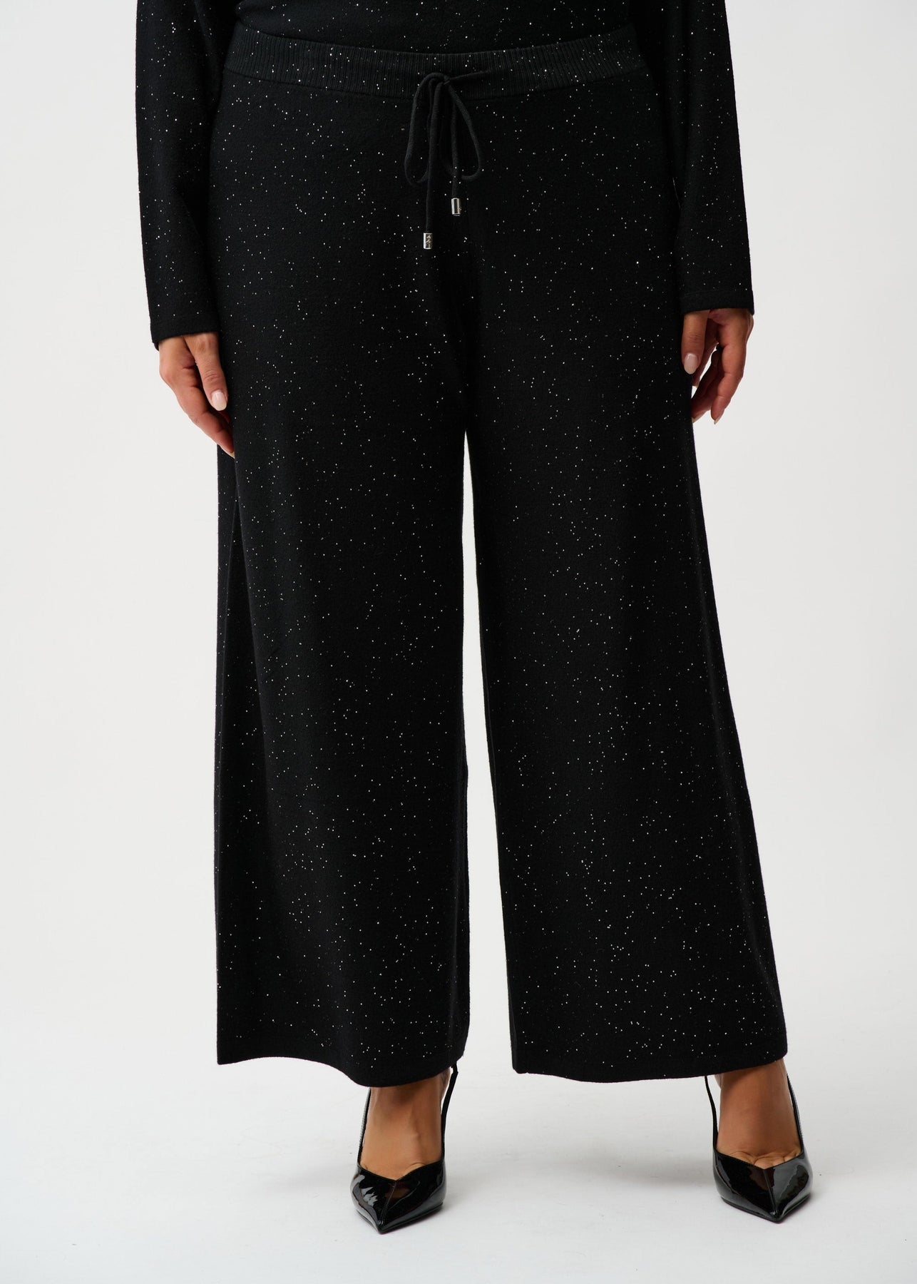 These Joseph Ribkoff culotte pants, made from a luxurious viscose blend sweater knit adorned with subtle sequins, combine sophistication with comfort. Featuring an elastic waistband with a drawstring, they provide a tailored fit perfect for occasions that demand refined style and elegance.