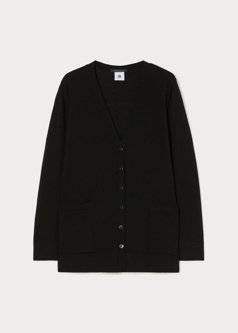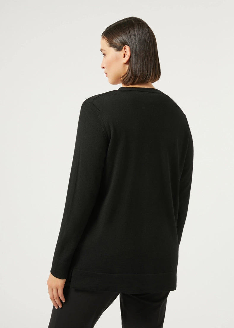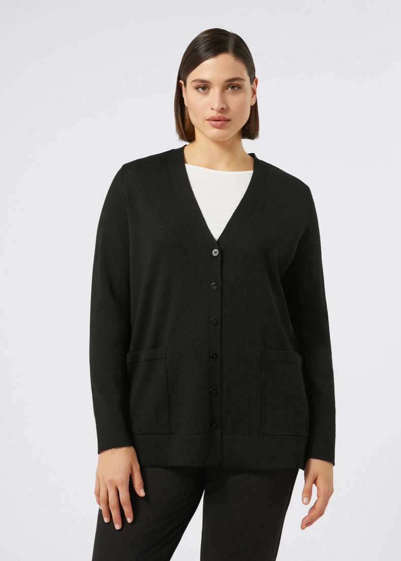 Elevate your everyday layers with this flared cardigan from the Marina Rinaldi main collection, crafted from pure extra-fine merino wool. Designed with a flattering V-neckline, patch pockets, side slits, and long sleeves, it’s a timeless, luxe essential with effortless appeal.