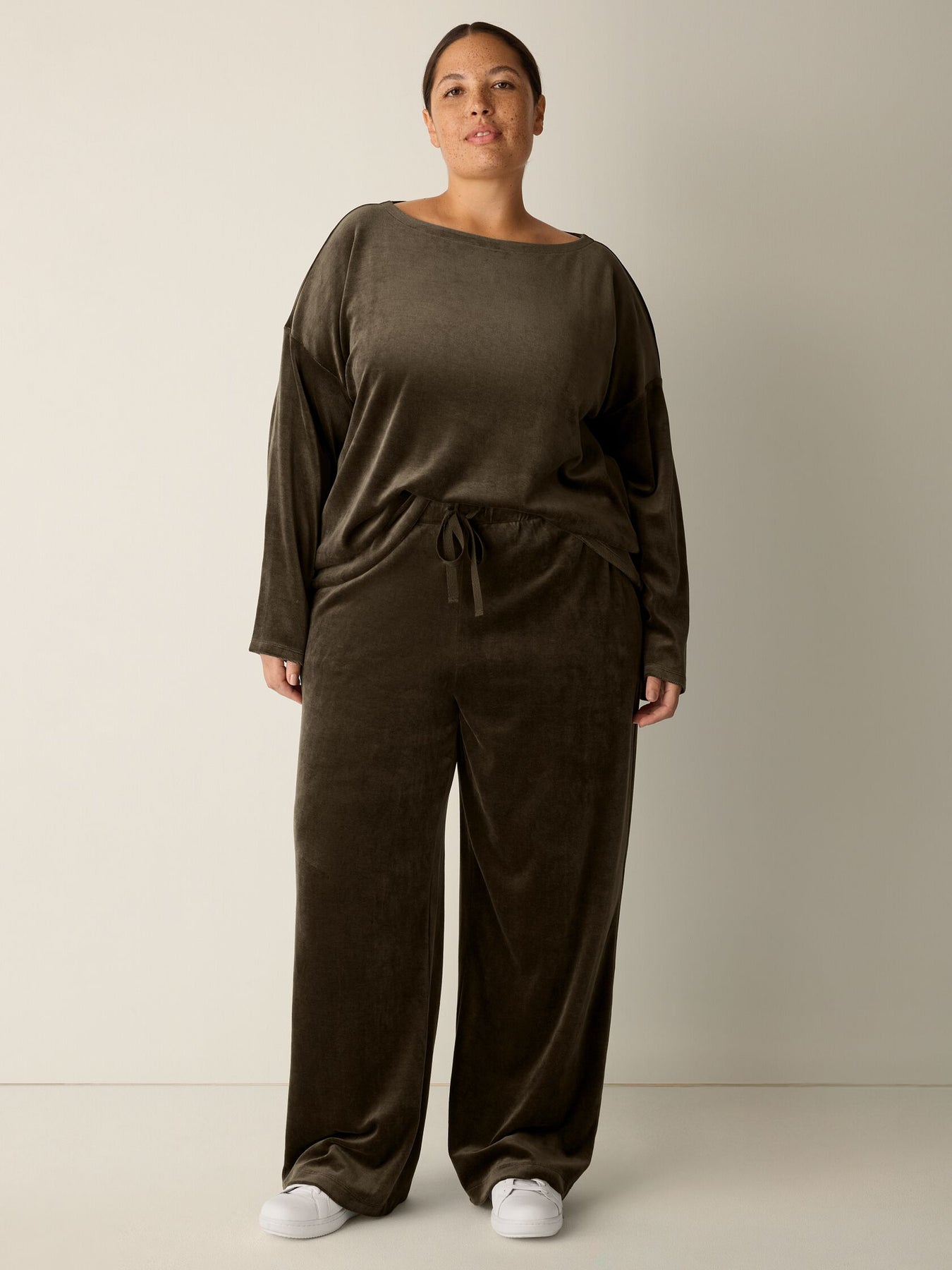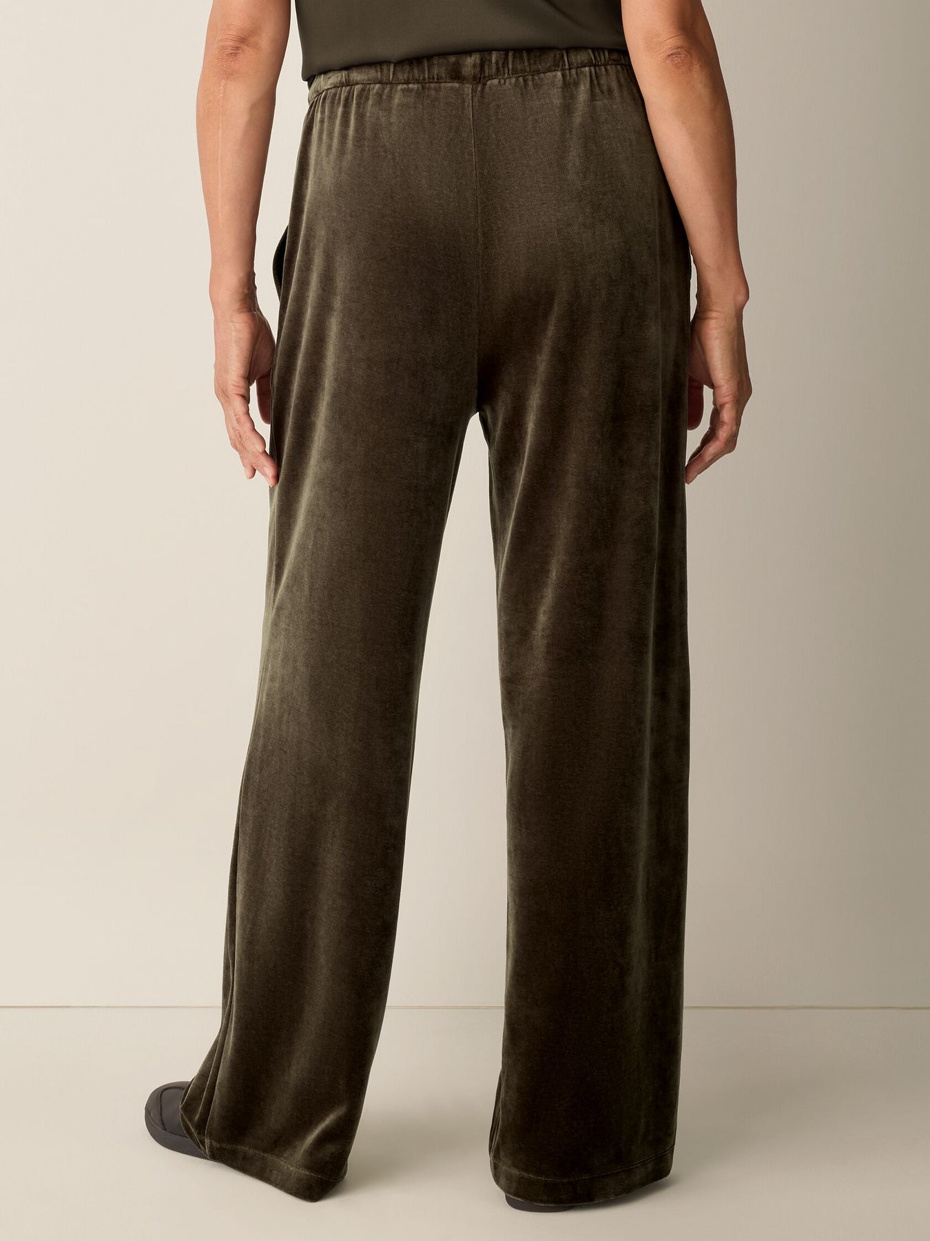 Elevated loungewear. A cozy wide-leg pant with a drawstring waist and pockets, in a soft velour knit made with organic cotton. Pair it with the matching top to make it a set
