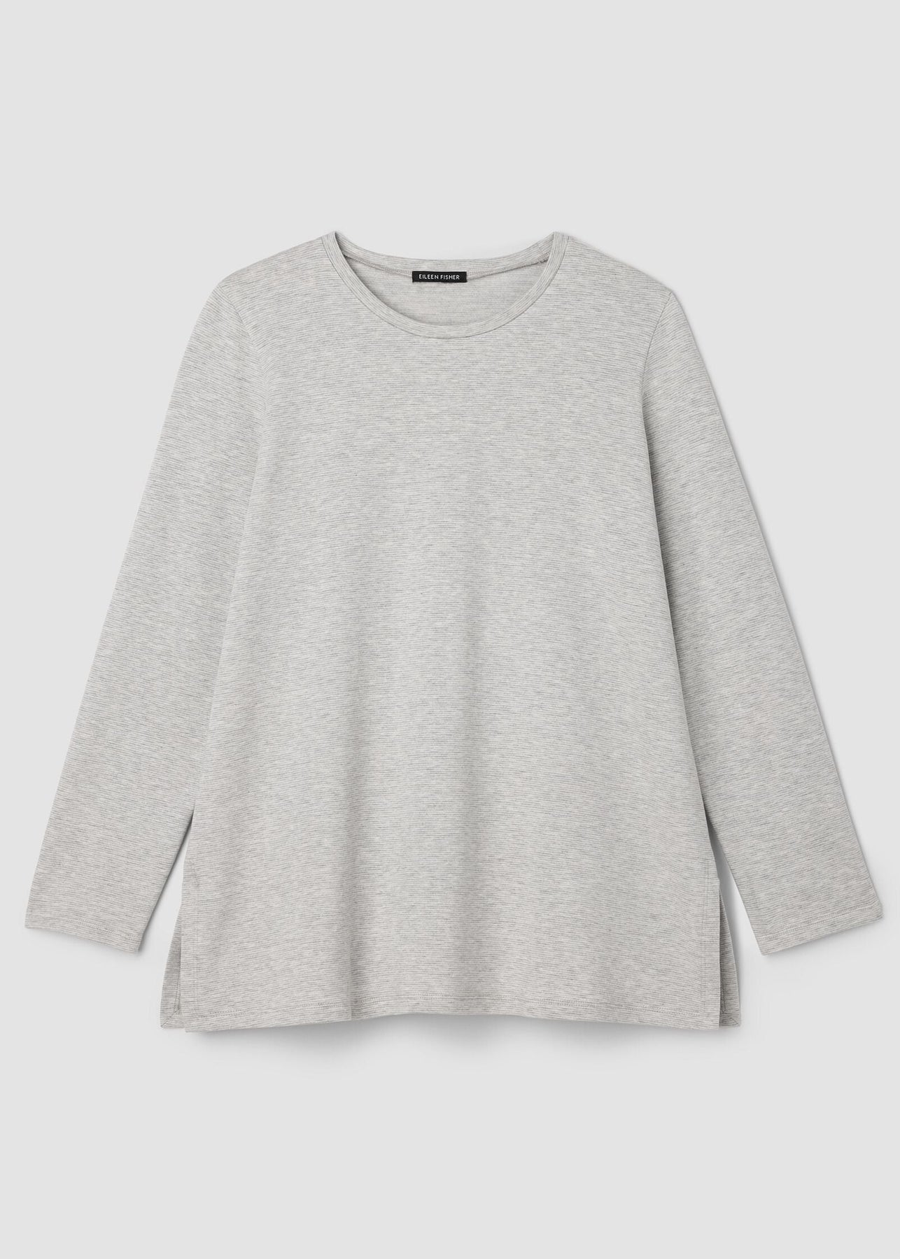 A simple shape for every day, elevated by stripes. The Eileen Fisher classic crew neck top with long lines and side slits, in fleecy terry.