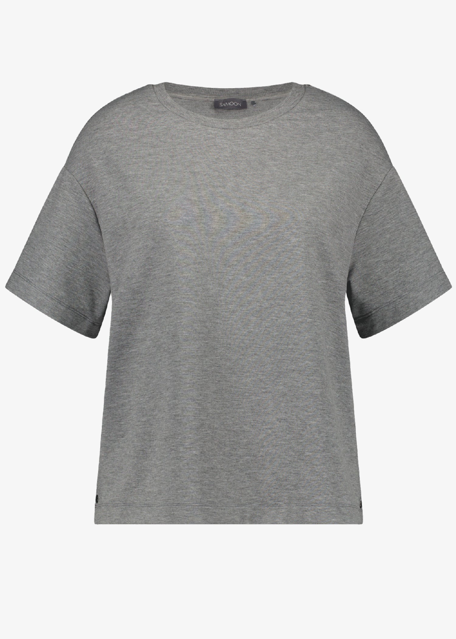 The Samoon short sleeve v neck top has a print front and jersey back that combines refined style with exceptional comfort. Made from a stretch viscose jersey fabric, it offers a soft, breathable feel that moves effortlessly with you. Its elegant print adds a subtle yet sophisticated touch, along with a drawstring hem for more styling options, making it an ideal choice for both casual and polished looks. Perfect for those who appreciate quality and understated design, this versatile piece elevates your everyday wardrobe with ease.