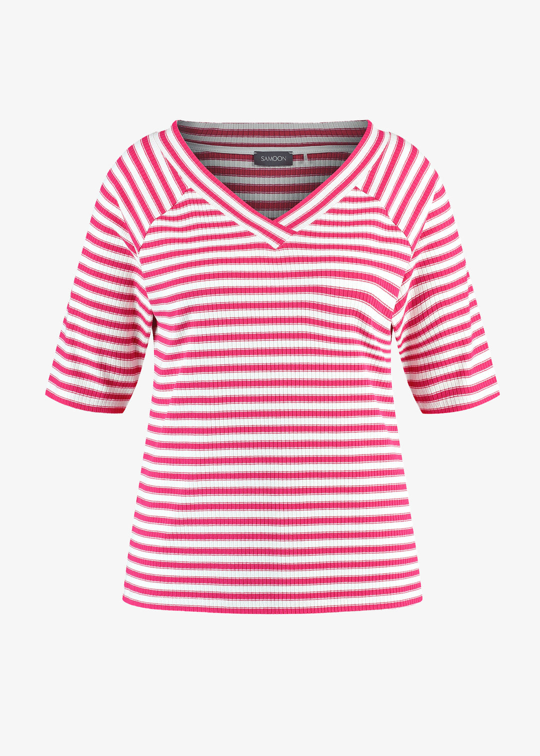 Samoon Striped V-neck Elbow Sleeve Tee in Barberry Red