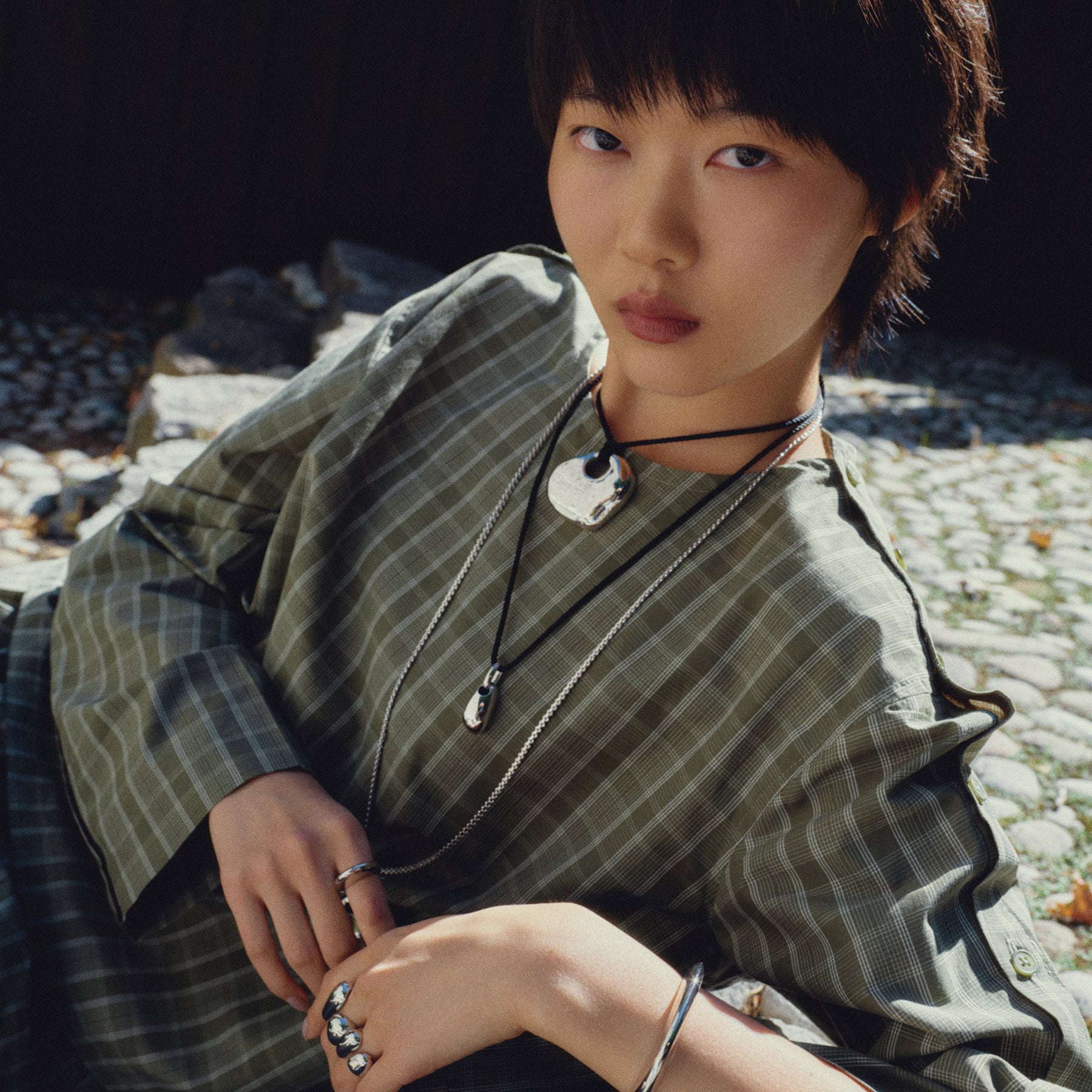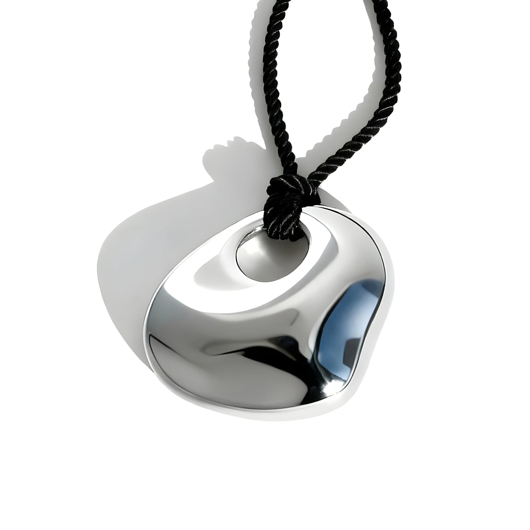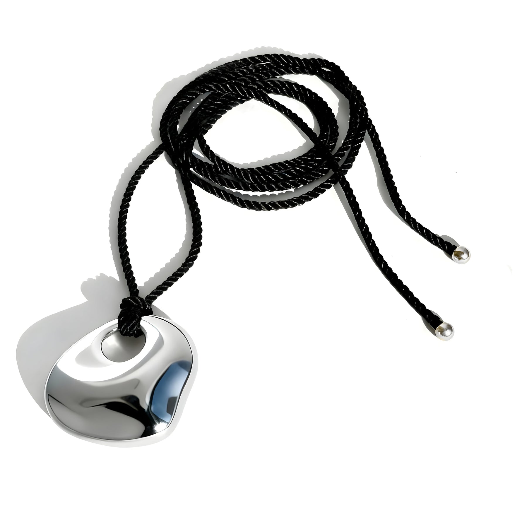 A BIKO curvaceous statement pendant cast from a real Greek beach pebble, suspends from a twisted satin cord with rounded metal caps, offering sculptural form and effortless wear. Style it long or short for endless day-to-night versatility.