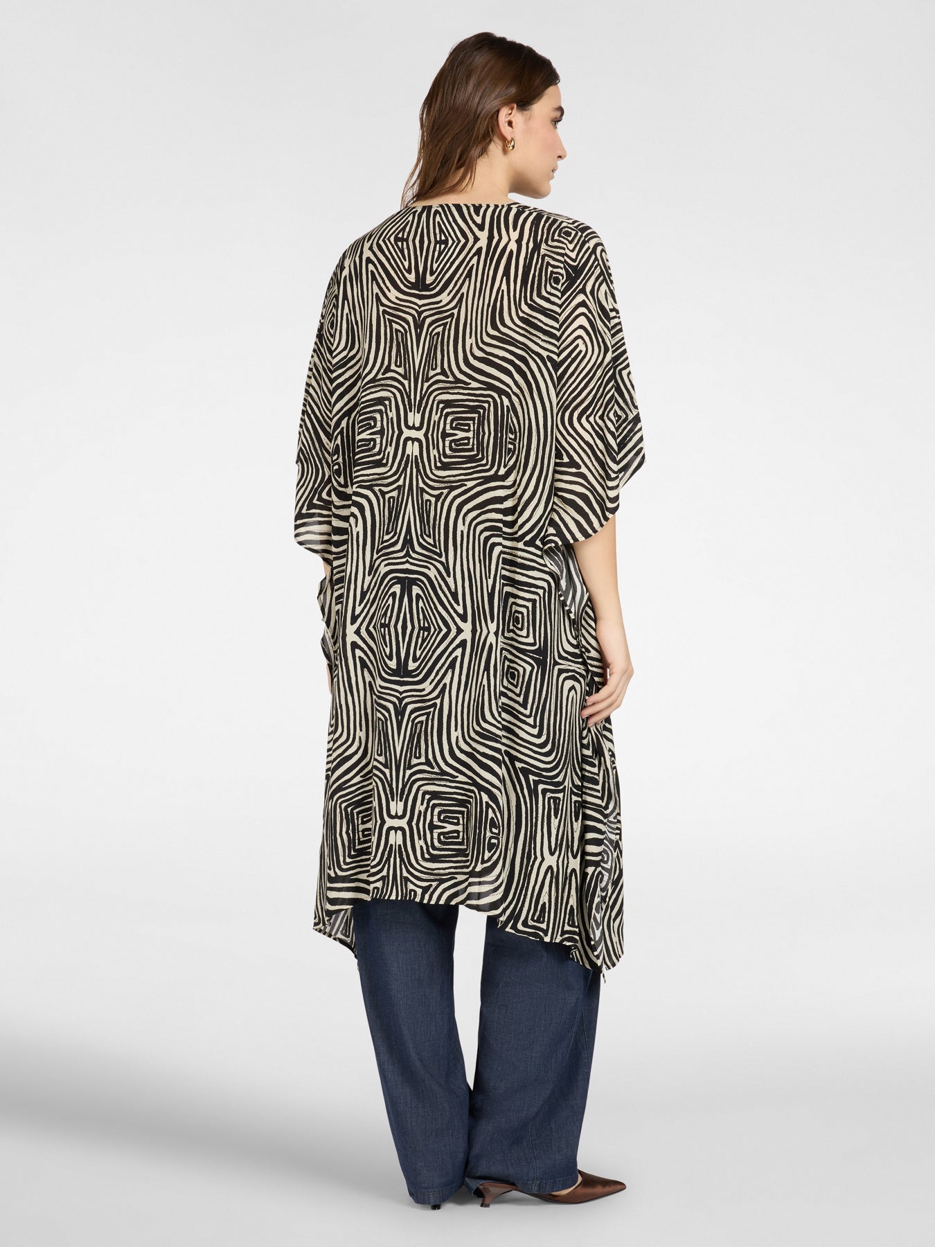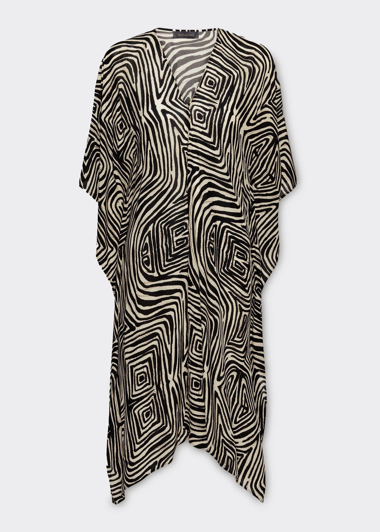 Effortless elegance meets comfort in this Elena Miro printed kaftan. Crafted from luxurious viscose crepe de chine, the flowing silhouette drapes beautifully while the striking geometric print adds visual interest. This versatile piece transitions seamlessly from day to evening wear.